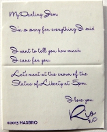 ![]() | Letter: White shiny card stock folded in half, purple script lettering. Attached to a pink piece of cardboard in the accessories tray.