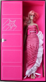 The box cover lifted off to reveal the doll inside - she is tied in with white ribbons and has a hair net threaded to the back "wall" to hold her hair in place. The knees are protected/held in place with clear vinyl. To the left of the doll is a thin cardboard "door" with the doll's name on it, which opens to reveal the accessory tray. Some parts are in plastic baggies or attached to a pink piece of cardboard. The stand base is behind her calves in a separate compartment. Behind the inner tray that holds both the doll and "locker" part is where the COA can be found. |
