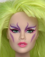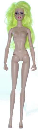 Caucasian ("Japan" skin tone, in Integrity terms) complexion, long pale fluorescent yellow hair with a fringe (length does seem to vary a bit), shorter strands to frame her face. She