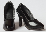 shoes: shiny grey-black faux patent leather pumps with black soles.