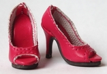 shoes: Leatherette raspberry open toed pumps, black soles.
