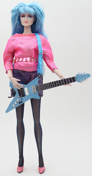 ![]() | Guitar: Blue with six nylon strings and whammy bar, comes attached with soft vinyl clear straps to a pink piece of cardboard. |