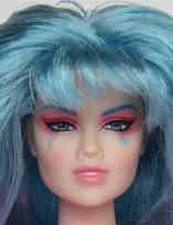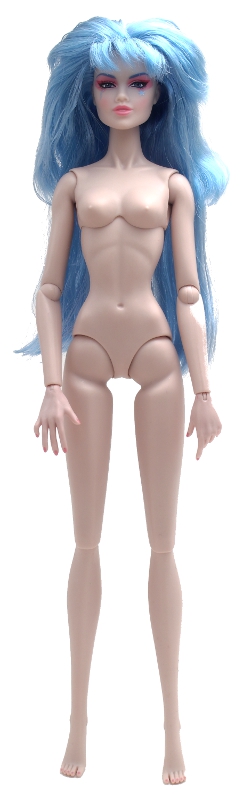 Caucasian ("Japan" skin tone, in Integrity terms) complexion, blue hair with a fringe, cut in layers. She has glued on black eyelashes & pierced ears, blue eyes and eyebrows, make up in pastel shades.