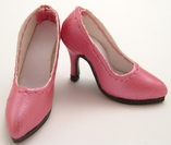 shoes: pale pink leatherette pumps, white interior, black soles. |