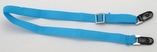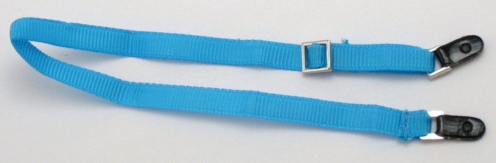 Guitar strap: blue ribbon with silver buckle, faux leather fasteners on ends. It came attached to a pink piece of cardboard with the earrings in a little baggie. |