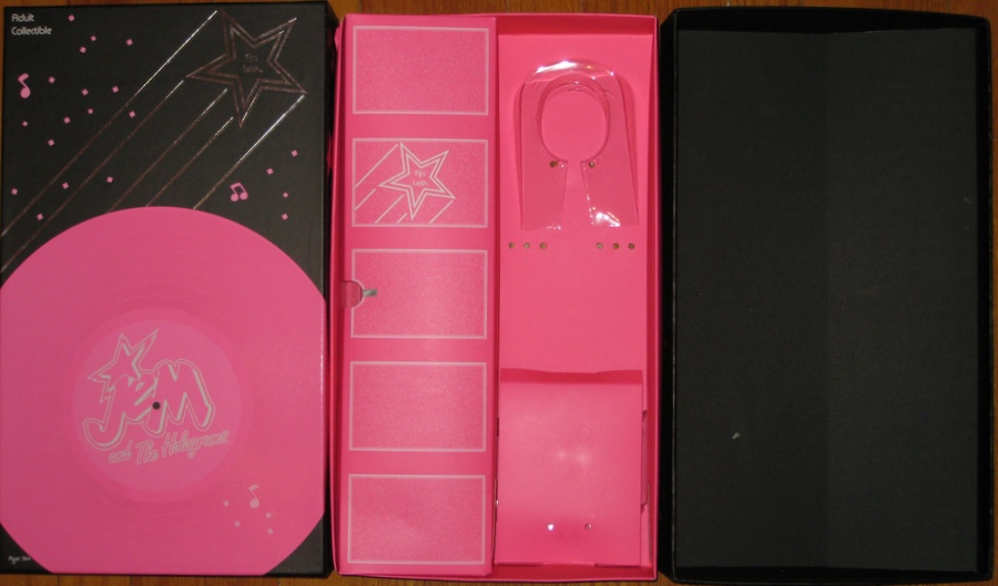 The inside of the top cover is black and has has a bright Jem logo & confetti/music notes design printed on the inside. The inner part of the back of the box is undecorated black. The doll display area is hot pink. |