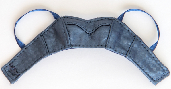 Bustier: checker board fine vinyl texture, lined with dark blue satiny material; blue ribbon straps. |