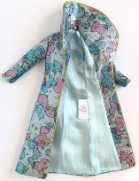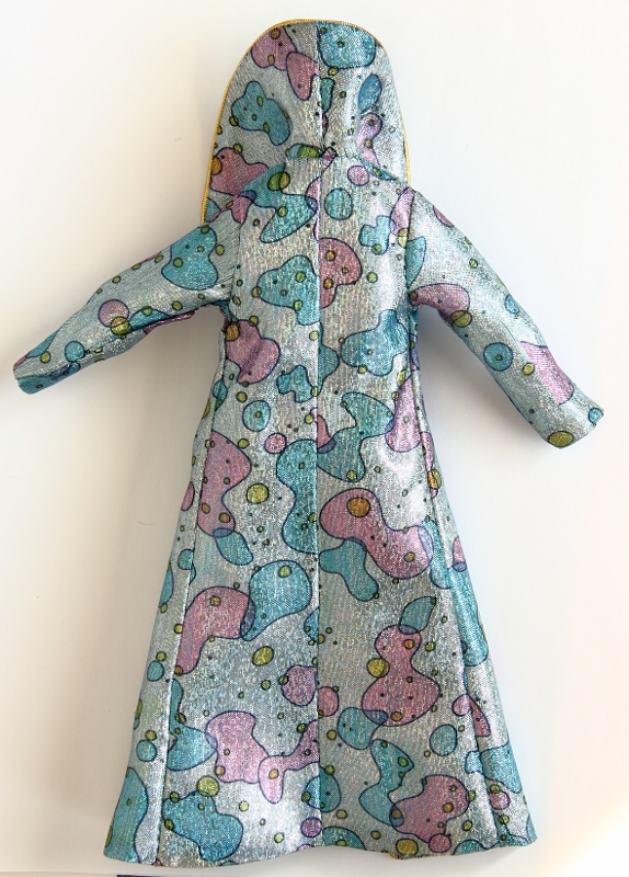 ![]() | Coat: Long, high collared, fine holographic metallic weave, has blue/pink/yellow blob-type designs. Lined with pale blue satiny material, trimmed with gold. No closures. (back of coat) |