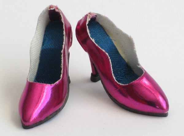 shoes: Metallic magenta with black soles and blue insoles. Have a scalloped edge. Came in a baggie in the accessories tray. |