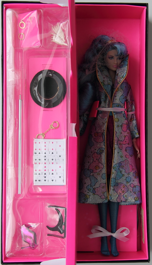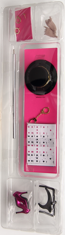 ![]() | The box cover lifted off to reveal the doll inside - she is tied in with white ribbons and has a hair net to hold her hair in place. The knees are protected/held in place with clear vinyl. To the left of the doll is a thin cardboard "door" with the doll's name on it, which opens to reveal the accessory tray. Some parts are in plastic baggies or attached to a pink piece of cardboard. The stand base is behind her calves in a separate compartment. Behind the inner tray that holds both the doll and "locker" part is where the COA and instructions can be found. |