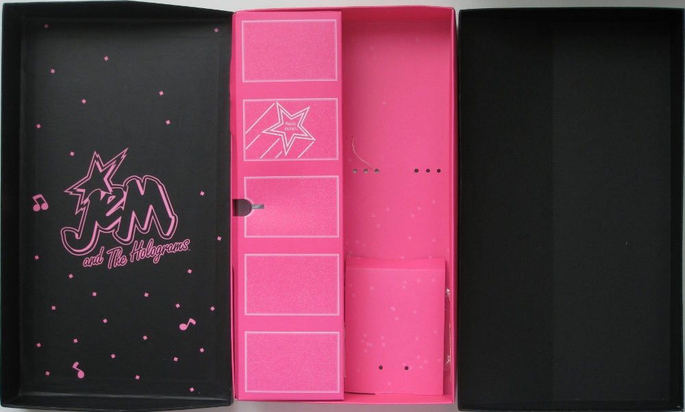The inside of the top cover is black and has has a bright Jem logo & confetti/music notes design printed on the inside. The inner part of the back of the box is undecorated black. The doll display area is hot pink. |