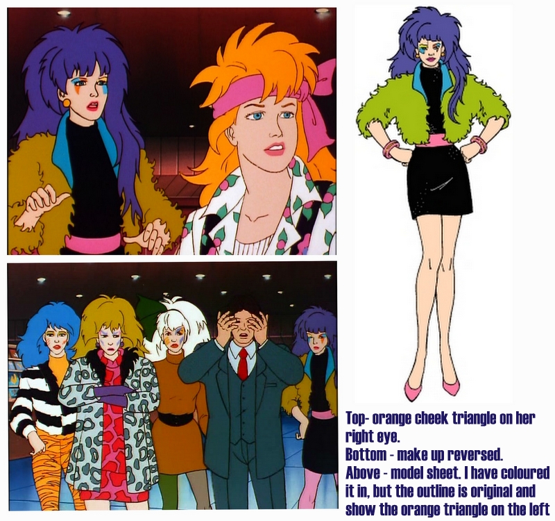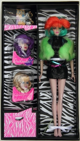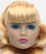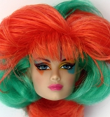 ![]() | pale Caucasian ("Japan" skin tone, in Integrity terms) complexion, purple hair, similar eye make up to the orange and teal doll, raspberry lip colour. Hair is longer than the teal/orange head, still has a curly rat tail that is in a small elastic at the base of her neck. |