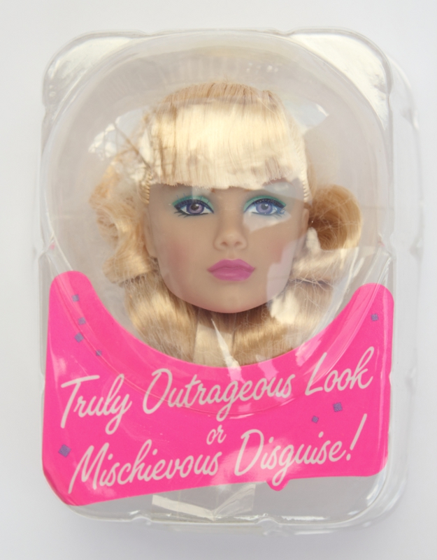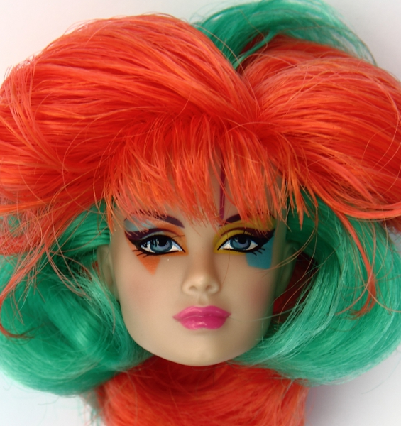 dark purple eyebrows, bright patchwork of eyeshadow. This was the head on the doll when packaged. All three heads use the same (Kimber Benton's) head mold.