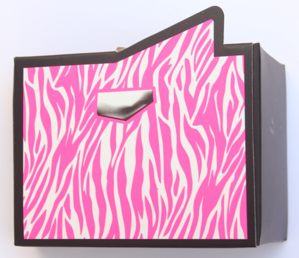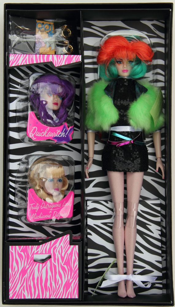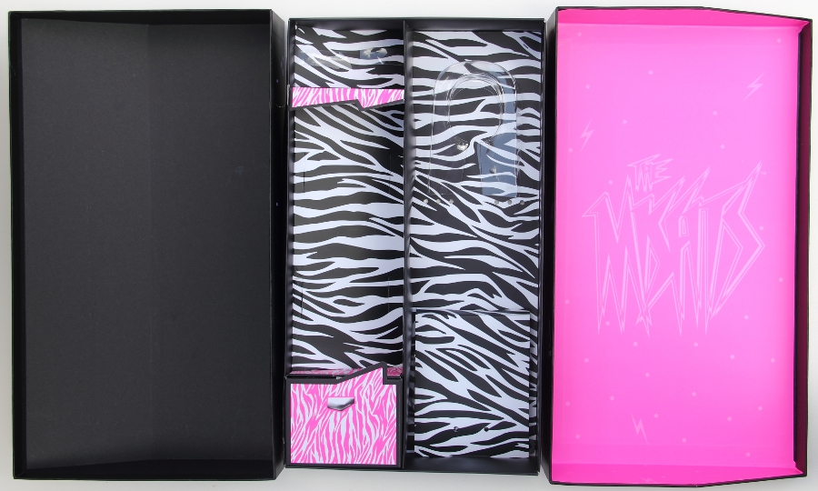 The inside of the top cover is bright pink with a white Misfits logo & confetti/music notes design printed on the inside. The inner part of the back of the box is undecorated black. The doll display area is white with black tiger stripes; the "door" has 5 panels of white and pink animal stripes design with the Misfits logo in black. It is the same for all of the Misfits. |