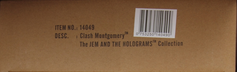 Shipper: A plain cardboard box with some printing on the bottom reading ITEM NO.: 14049/DESC.: Clash MontgomeryTM/The JEM AND THE HOLOGRAMSTM Collection. The doll box was wrapped in clear cellophane bag. |