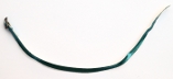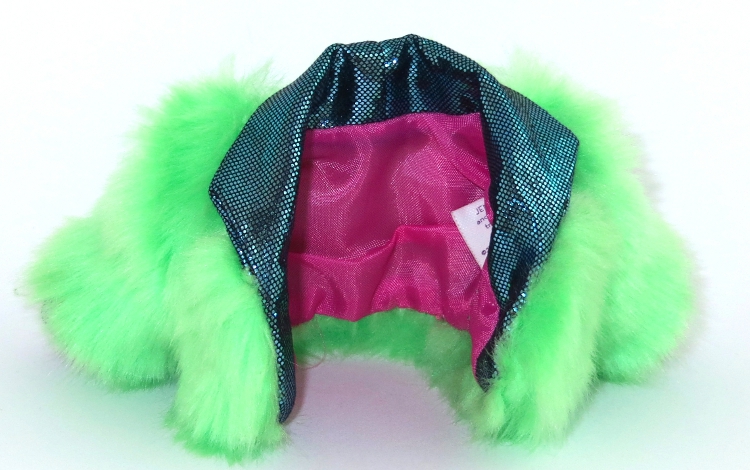 bolero jacket: lime green faux fur, trimmed with shiny dark blue lapels and cuffs. Lined with raspberry satin material. It is tack sewn to her dress to keep it in place during shipment. |
