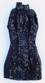 mini dress: black micro sequined sheath dress with turtleneck. Lined in black satiny material. Closes in the back with hook and eye fasteners. |