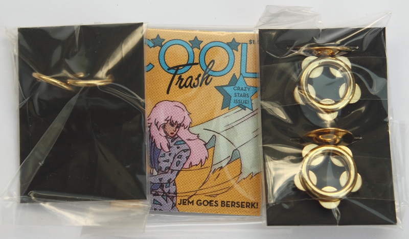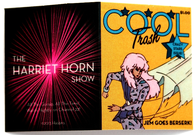 ![]() | Box: Satin finish black box with a diagonal edge, purple music notes and confetti shape, "record" with Jem logo & embossed grooves. The boxes, other than the UPC code on the bottom are the same for Clash Montgomery, Jetta Burns, Phyllis "Pizzazz" Gabor, Roxanne "Roxy" Pelligrini & Mary “Stormer” Phillips. |