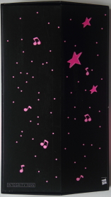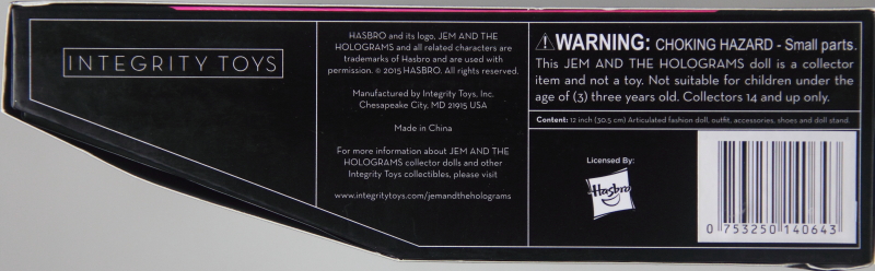 ![]() | The back is comprised mostly of a black background and a repetition of the pink music notes/stars/confetti design in pink. It has the 2014 Integrity Toys logo. |