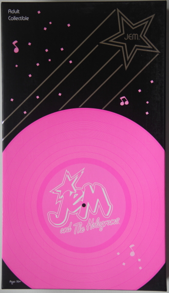 The inside of the top cover is hot pink and has has a bright Jem logo & confetti/music notes design printed on the inside. The inner part of the back of the box is undecorated black. The doll display area is hot pink. |