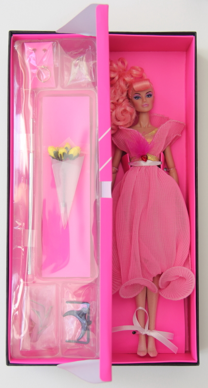 ![]() | The box cover lifted off to reveal the doll inside. She is tied in with white ribbons. To the left of the doll is a thin cardboard "door" with the doll's name on it, which opens to reveal the accessory tray. They are inside a long rectangular clear plastic tray with little cups that hold the earrings, hands, shoes, stand parts, etc. Some parts are in plastic baggies or attached to a pink piece of cardboard. The stand base is behind her calves in a separate compartment. Behind the inner tray that holds both the doll and "locker" part is where the COA and instructions can be found. |