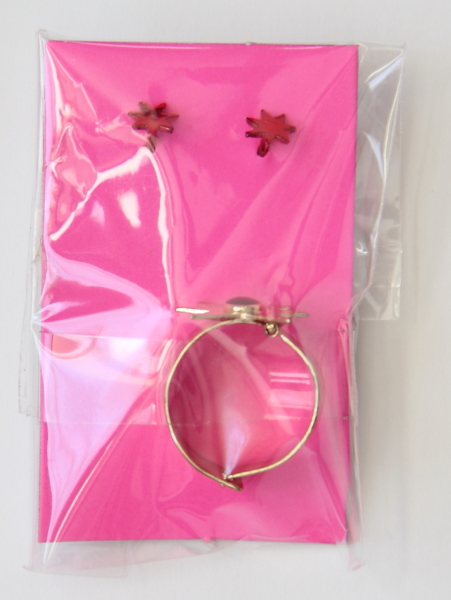 ![]() | Jemstar Earrings: red painted metal earrings. They came poked through a hot pink piece of cardboard, with the necklace.