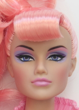 face mold, lilac eyes, eyeshadow is in shades of purple and pink, pale