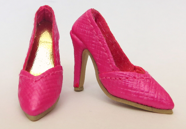 shoes: Hot pink textured leatherette with gold insoles. Like Showtime Jem, the back of the shoe and front of the shoe are two separate parts. |