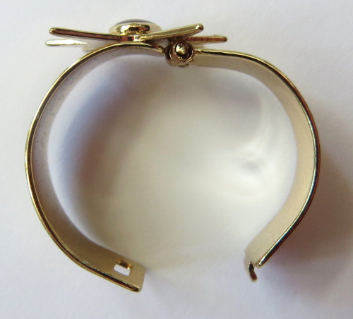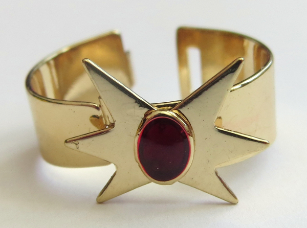 ![]() | Choker necklace: gold tone metal with a starburst design, oval shaped red enamel decoration. Opens with a clasp. Came with the earrings on a hot pink piece of cardboard. |