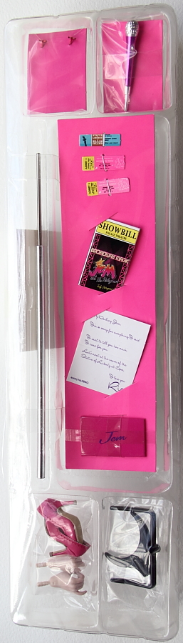 The box cover lifted off to reveal the doll inside - she is tied in with white ribbons and has a hair net threaded to the back "wall" to hold her hair in place. The knees are protected/held in place with clear vinyl. To the left of the doll is a thin cardboard "door" with the doll's name on it, which opens to reveal the accessory tray. Some parts are in plastic baggies or attached to a pink piece of cardboard. The stand base is behind her calves in a separate compartment. Behind the inner tray that holds both the doll and "locker" part is where the COA can be found. |
