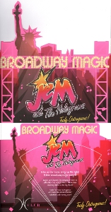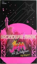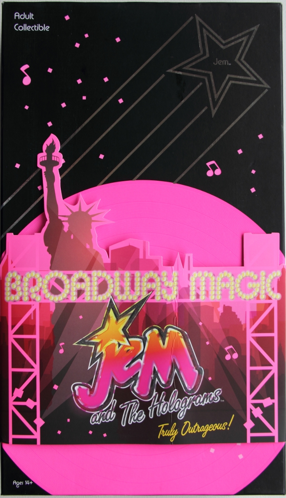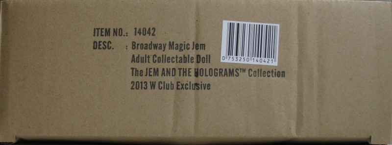 Shipper: A plain cardboard box with some printing on the bottom reading ITEM NO.: 14042/DESC.:Broadway Magic Jem/Adult Collectable Dressed Doll/The JEM AND THE HOLOGRAMSTM Collection/2013 W Club Exclusive. This box is slightly larger than most of the other Integrity Jem boxes, in order to accommodate the stage diorama. The doll box was wrapped in clear cellophane bag. |