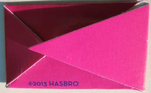 ![]() | Letter: White shiny card stock folded in half, purple script lettering. Attached to a pink piece of cardboard in the accessories tray.