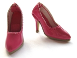 shoes: Rose faux-patent leather straight edged pumps, pink insoles, tan soles. Came in a baggie in the accessory tray. |