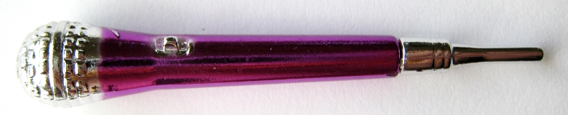 Cordless Microphone: Chromed plastic with fuchsia grip. Came attached to a piece of pink card stock, in a baggie.