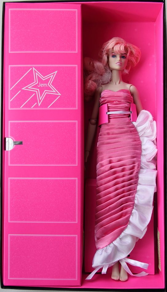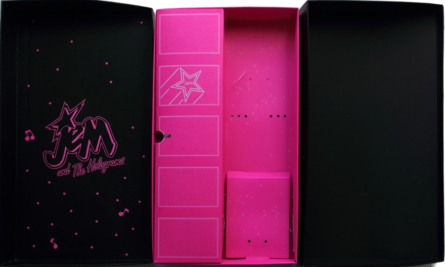 The inside of the top cover is black and has has a bright Jem logo & confetti/music notes design printed on the inside. The inner part of the back of the box is undecorated black. The doll display area is hot pink. |