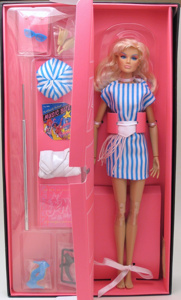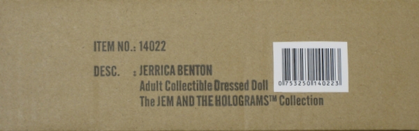 Shipper: A plain cardboard box with some printing on the bottom reading ITEM NO.: 14022/DESC.:JERRICA BENTON/Adult Collectible Dressed Doll/The JEM AND THE HOLOGRAMSTM Collection. The doll box was wrapped in clear cellophane bag. |