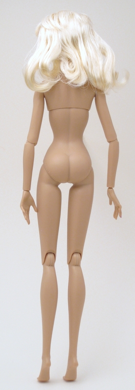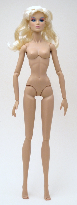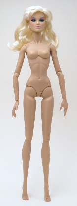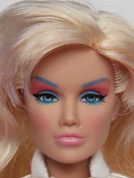(FR White, in Integrity terms) complexion, platinum blond hair in two layers, curled at the ends, top layer is shorter. She has glued on black eyelashes & pierced ears, blue eyes and eyebrows, make up in pastel shades.
