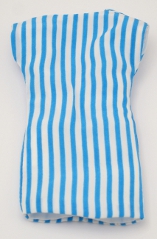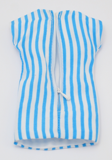 Dress: White and aqua vertically striped sleeveless shift dress, lined with white satiny material, tagged. Has a white zipper in back topped with a hook and eye closure. |