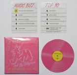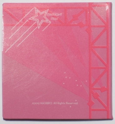 ![]() | The back is comprised mostly of a black background and a repetition of the pink music notes/stars/confetti design in pink. |