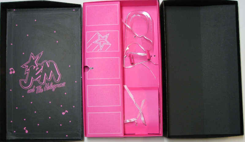 The inside of the top cover is black and has has a bright Jem logo & confetti/music notes design printed on the inside. The inner part of the back of the box is undecorated black. The doll display area is hot pink. |