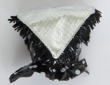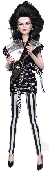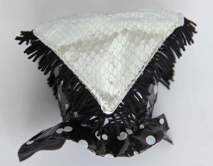 Top: Shiny black sleeveless 'pleather' with screened white polka dots, fitted at the waist so it can tuck into her matching skirt. Lined with black satiny material; attached to front is a very large silver snake-skin textured triangular black-fringed bib/collar. Hook-and-eye closures. |