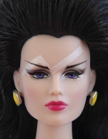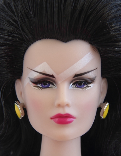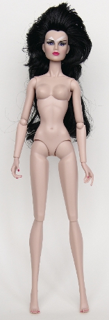Caucasian ("Japan" skin tone, in Integrity terms) complexion, extra long black hair that frames the face; violet eyes, grey/white and black shimmery eye make up; hand