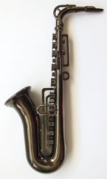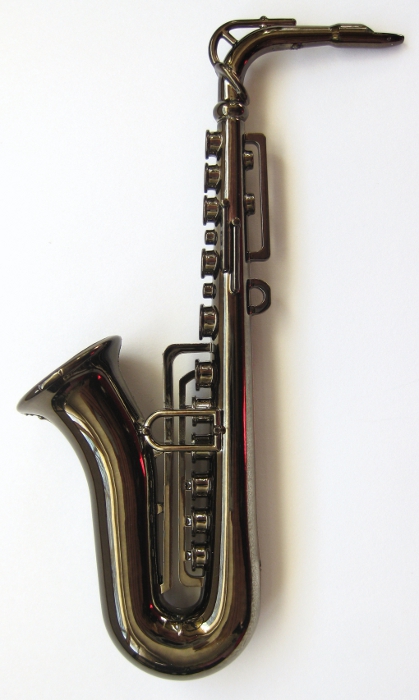 Saxophone: Shiny metallic black plastic. came attached to a piece of black card stock.