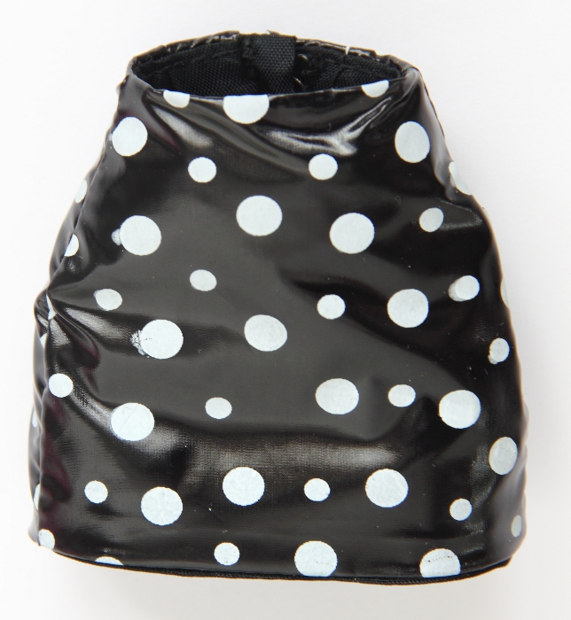 Skirt: Shiny black sleeveless 'pleather' with screened white polka dots, black lining. Matches the top. Hook-and-eye closures. |