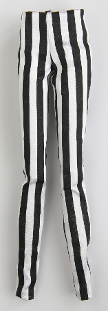![]() | Pants: White satin with black screened stripes, skinny leg satiny pants, hook-and-eye closure in back.