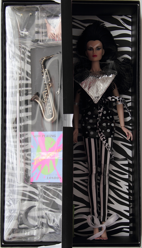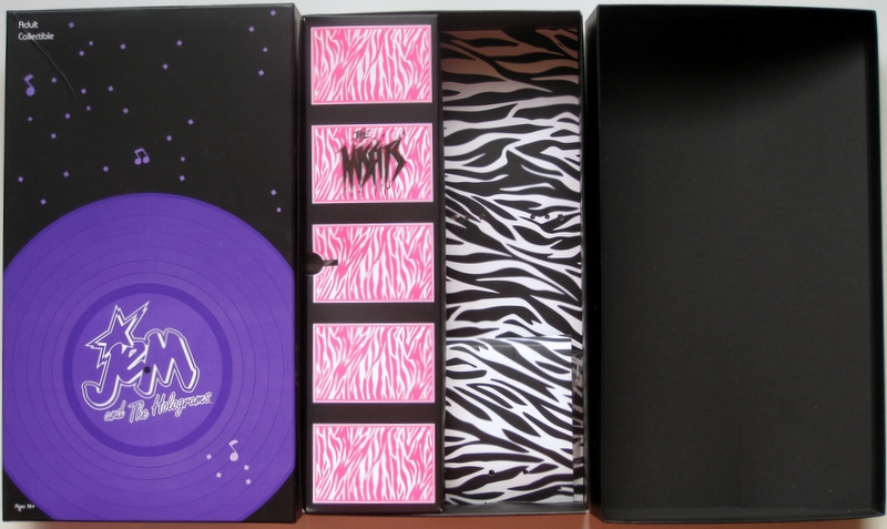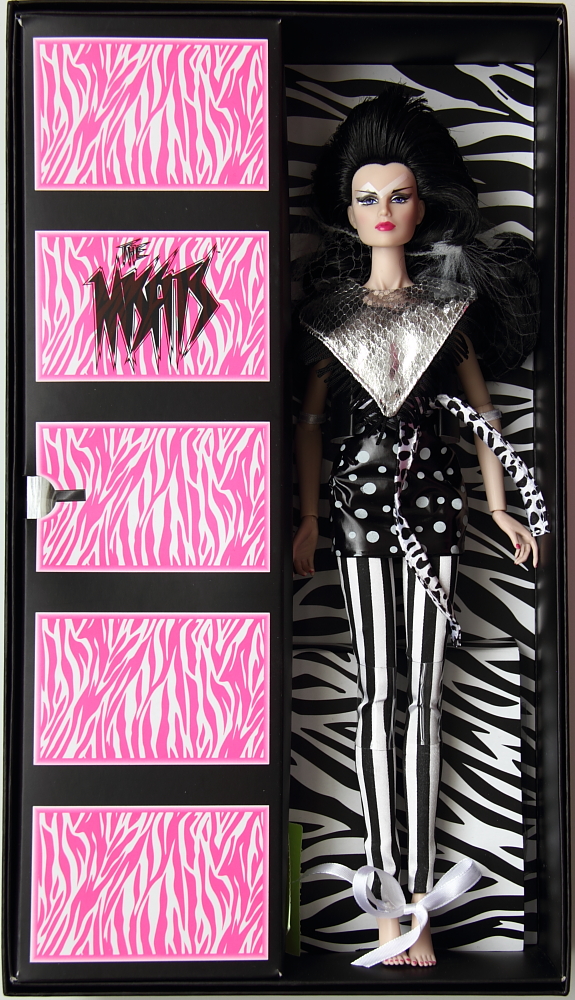 ![]() | The inside of the top cover is bright pink with a white Misfits logo & confetti/music notes design printed on the inside. The inner part of the back of the box is undecorated black. The doll display area is white with black tiger stripes; the "door" has 5 panels of white and pink animal stripes design with the Misfits logo in black. It is the same for all of the Misfits. |