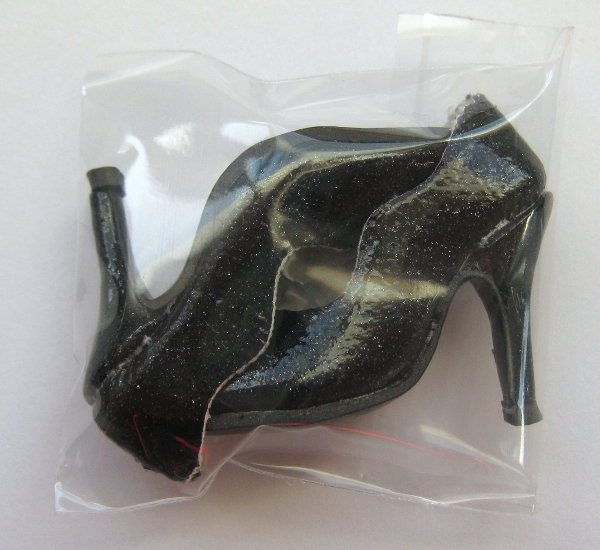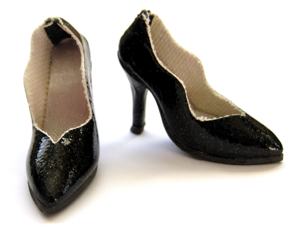 shoes: Black pumps with scalloped edges, there is a fine glitter on them. Black soles, beige insoles. Came in a baggie.