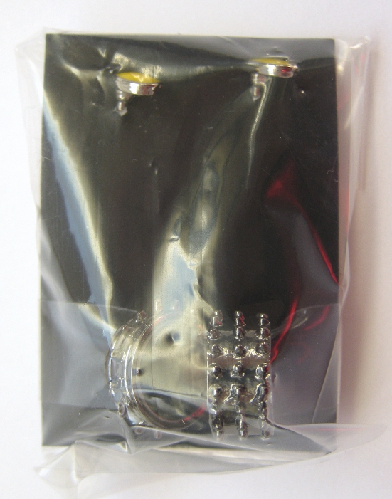 ![]() | short spiked bracelet: hematite-toned metal. Came attached to a piece of black card stock in a baggie with the other jewellery. |