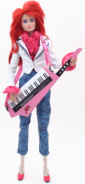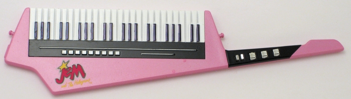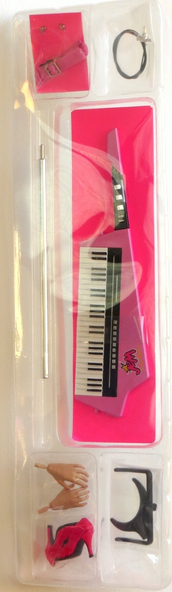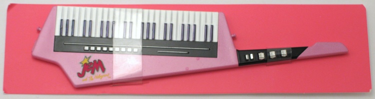 ![]() | Keytar: Pink with the Jem logo. Comes attached with soft vinyl clear straps to a pink piece of cardboard.