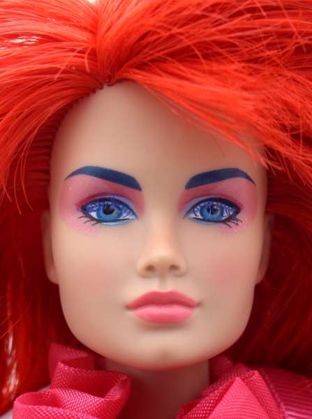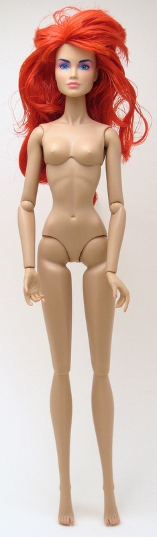 (FR White, in Integrity terms) complexion, long bright red hair, thick bangs and two shorter strands to frame her face . She has glued on blue eyelashes & pierced ears, blue eyes and eyebrows, make up in pastel shades.